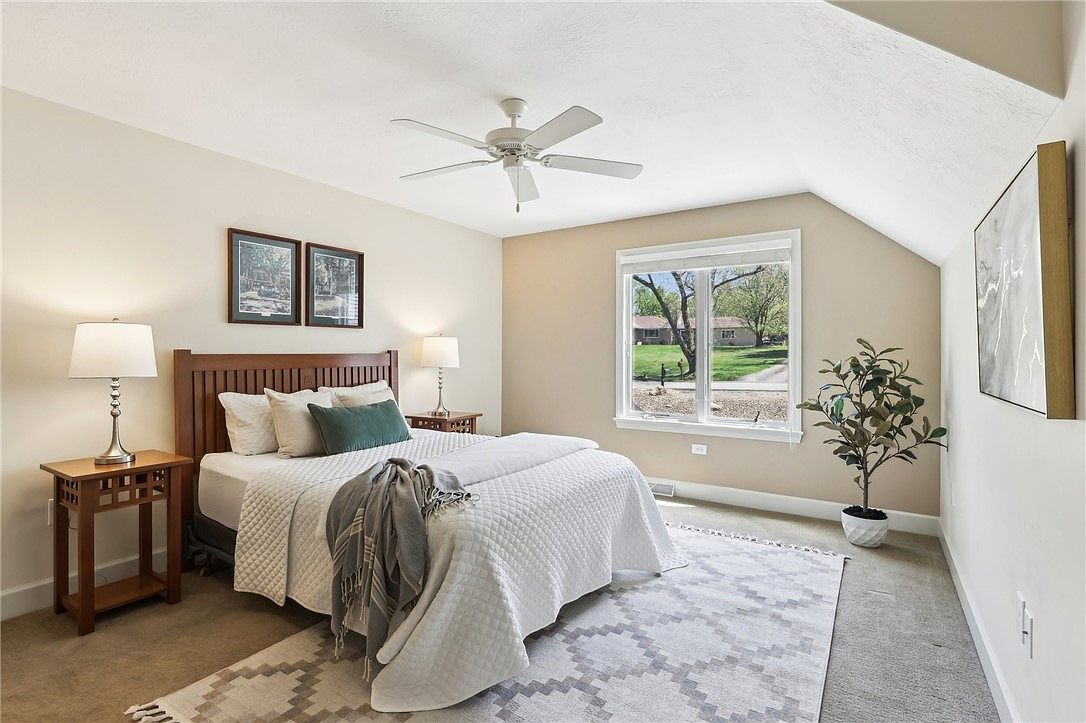 This cozy bedroom features a soft neutral palette with beige walls and light carpeting, creating a warm and inviting atmosphere. A large window floods the room with natural light, highlighting the textured white bedding atop a wooden slatted headboard. Matching wooden nightstands flank the bed, each topped with elegant silver lamps that add symmetry and subtle sophistication. A ceiling fan above provides both comfort and an architectural focal point. The patterned area rug beneath the bed adds visual interest, complemented by green accent pillows and a potted plant in the corner, infusing a touch of nature into the serene space.