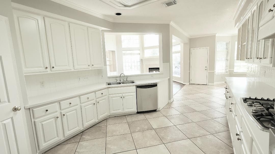 This kitchen features an open layout with white cabinetry that extends along two walls, creating ample storage. The countertops are clean and white, complementing the overall bright and airy feel. Stainless steel appliances, including a dishwasher and gas stove, add a modern touch to the space. The light beige tiled floor blends subtly with the neutral wall colors, which are light gray. A large pass-through window above the sink provides a view into an adjacent room filled with natural light, highlighted by expansive windows and a fireplace, making the kitchen ideal for both cooking and socializing.
