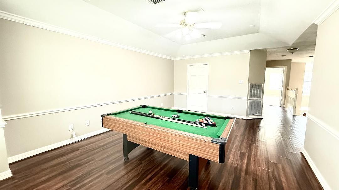 This game room features a classic pool table with a green felt surface that contrasts nicely against the warm, medium-toned wood flooring. The walls are painted in a soft cream shade with white chair rail molding adding subtle architectural detail. The layout is open and spacious with a ceiling fan providing overhead illumination and ventilation, while natural light streams in from an unseen source, brightening the area. The room leads to adjacent spaces via an open doorway, highlighting a functional flow. The overall aesthetic is simple, clean, and inviting, ideal for casual entertainment and leisure.