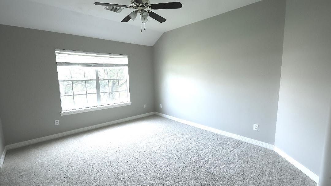 This bedroom features a subtle, calming color palette dominated by soft gray walls that complement the plush, light-toned carpeting. A large window allows natural light to fill the space, enhancing the airy and serene atmosphere. The vaulted ceiling adds architectural interest, crowned with a ceiling fan featuring dark blades contrasting with the lighter ceiling color. White baseboards and window trim provide clean, sharp lines, framing the room elegantly. The minimalist design offers a blank canvas for personalized decor, making it a versatile space for rest and relaxation.