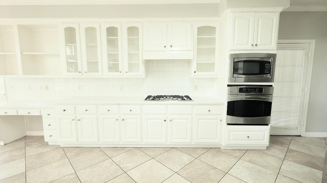 This kitchen area is characterized by a clean, bright aesthetic with a predominantly white color scheme. The cabinetry stretches horizontally across the space, featuring upper cabinets with glass-paned doors and solid lower cabinets with silver knobs, providing ample storage. A built-in gas cooktop is centrally located beneath a minimalistic white vent hood integrated into the cabinetry. To the right, a stacked stainless steel microwave and oven offer a sleek contrast against the white cabinetry. The floors are tiled in large beige tiles set diagonally, adding visual interest and warmth to the neutral palette. A door with blinds is visible, indicating access to an outdoor area or another room.