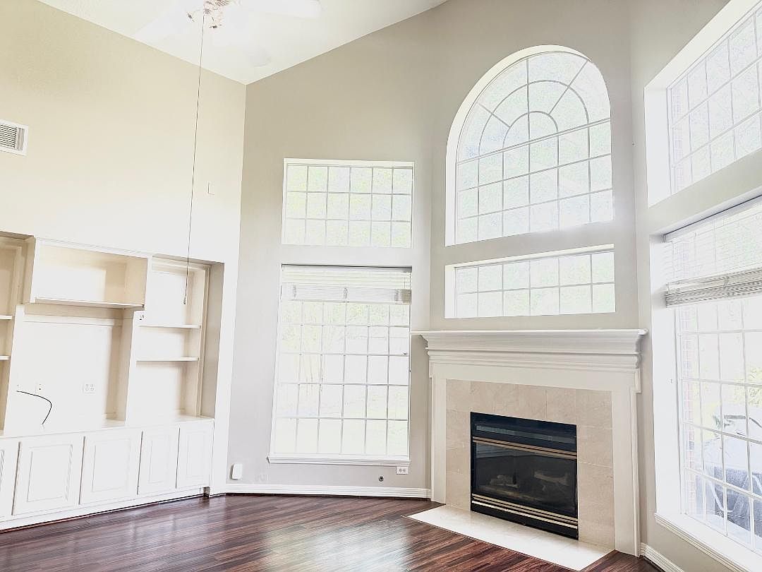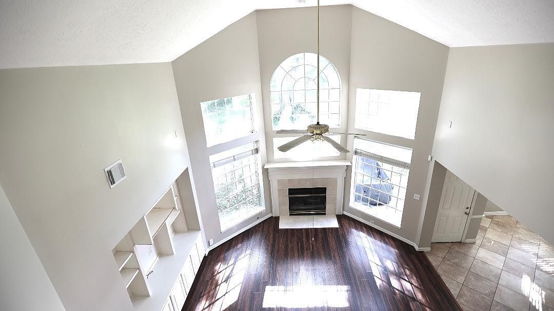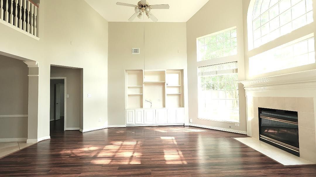 This spacious living room features soaring ceilings and large windows that flood the space with natural light. The flooring is a rich, dark wood that contrasts beautifully with the light neutral walls, creating an inviting and warm atmosphere. A ceiling fan hangs centrally to provide airflow, while built-in white cabinetry offers ample storage and display space, adding both functionality and charm. The room also includes a classic fireplace with a light stone surround, enhancing the cozy ambiance. Architectural details like the curved entryway and upper balcony railing add character and enhance the open layout.