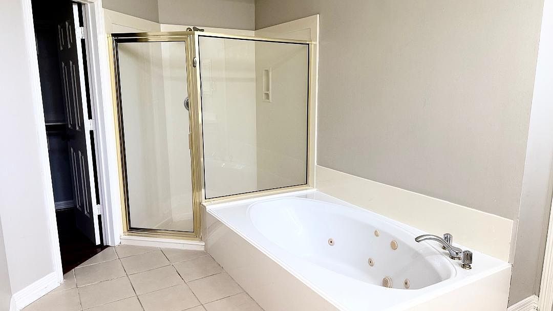 This bathroom showcases a functional arrangement combining a glass-enclosed corner shower and a built-in jetted bathtub. The shower features brass-tinged framing that adds a warm metallic accent, contrasting softly with the neutral pale gray walls. The tub, with its clean white surface and built-in jets, is spacious enough for a relaxing soak. Off-white tile flooring extends through the space, complementing the light wall color and creating a cohesive look. A small, recessed niche inside the shower offers practical storage, while the simple, understated fixtures keep the space open and airy.