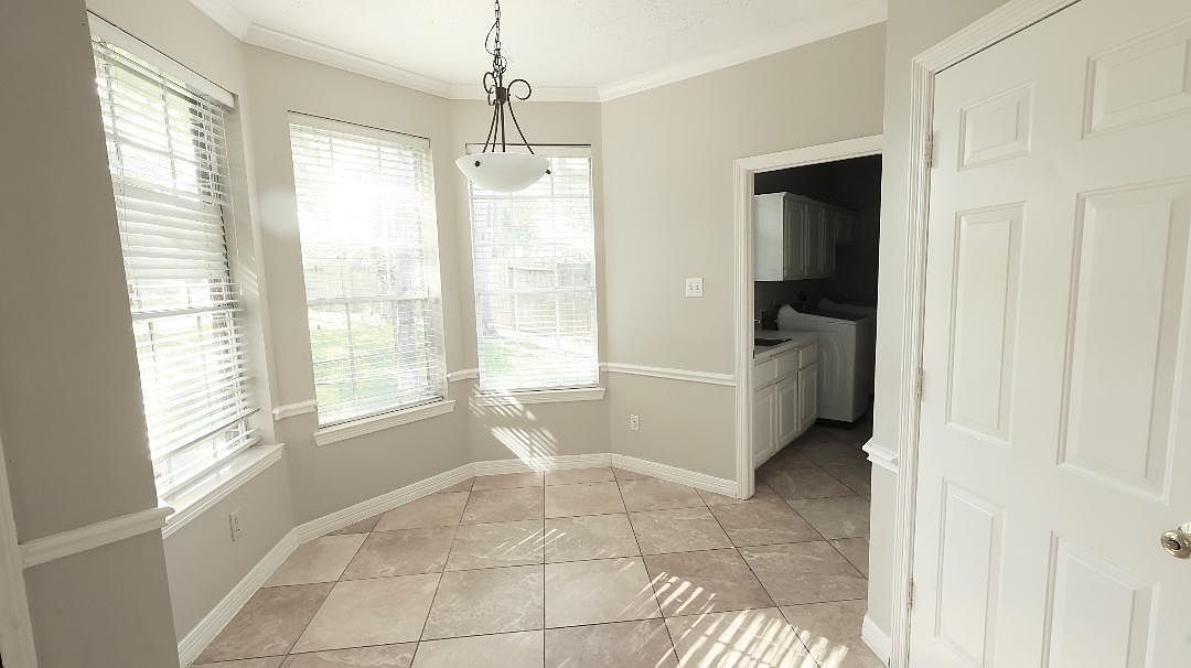This cozy breakfast nook features a bright, airy ambiance with three large windows allowing natural light to flood the tiled floor area, enhancing the spaciousness and openness. The soft beige walls paired with white trim and chair rail details create a clean, classic aesthetic. An elegant pendant light fixture hangs centrally, providing a warm glow for morning meals or casual dining. The adjacent doorway leads to a laundry or utility room, emphasizing functional flow. Overall, the space balances practicality with inviting charm, making it perfect for informal family gatherings and morning coffee rituals.