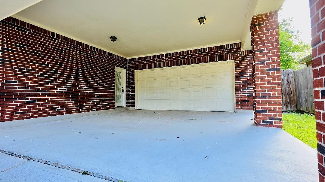 This covered garage area features a spacious and clean concrete floor, framed by rich red brick walls that add a classic and sturdy visual appeal. The ceiling is painted white with recessed lighting fixtures providing functional illumination. A white, paneled double garage door serves as the focal point at the back, complemented by a single door with a glass pane and white trim on the left side, likely leading into the interior of the house. The design balances practicality with simple elegance, accentuated by the outdoor greenery peeking through on the right side, creating an inviting transition from outdoors to indoors.