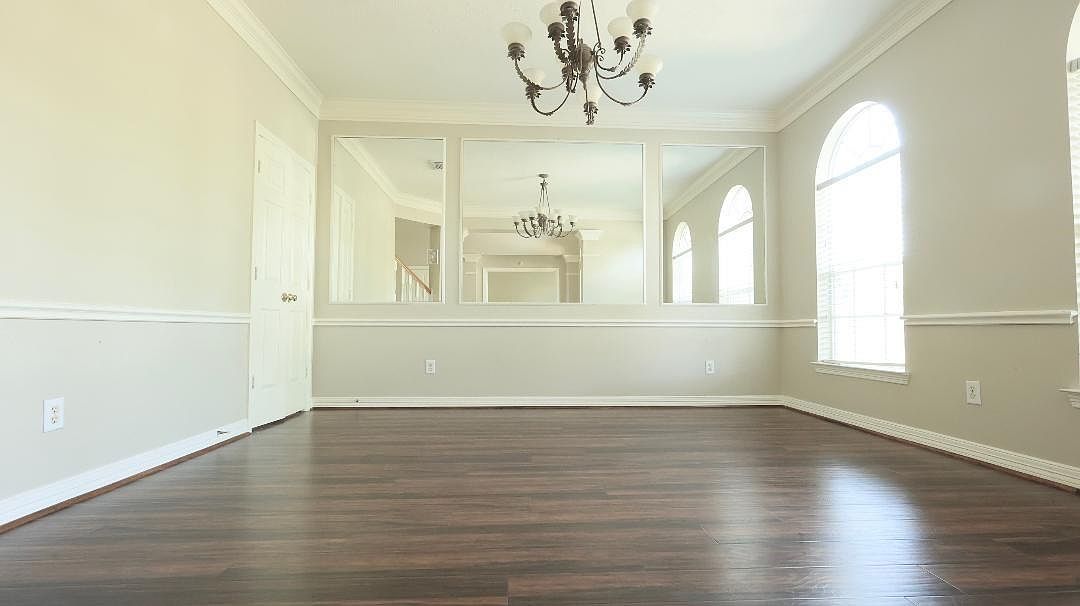 This dining room features a spacious layout with rich, dark wood flooring that contrasts beautifully against soft, neutral beige walls. The room is enhanced by large, arched windows that flood the space with natural light, emphasizing its airy feel. A classic chandelier with multiple light fixtures hangs centrally from a simple, white ceiling, adding elegance without overwhelming the room’s understated charm. A striking feature wall with three large mirrors reflects light and visually expands the space. White baseboards and chair rails offer crisp architectural details, completing the room’s timeless and inviting aesthetic.