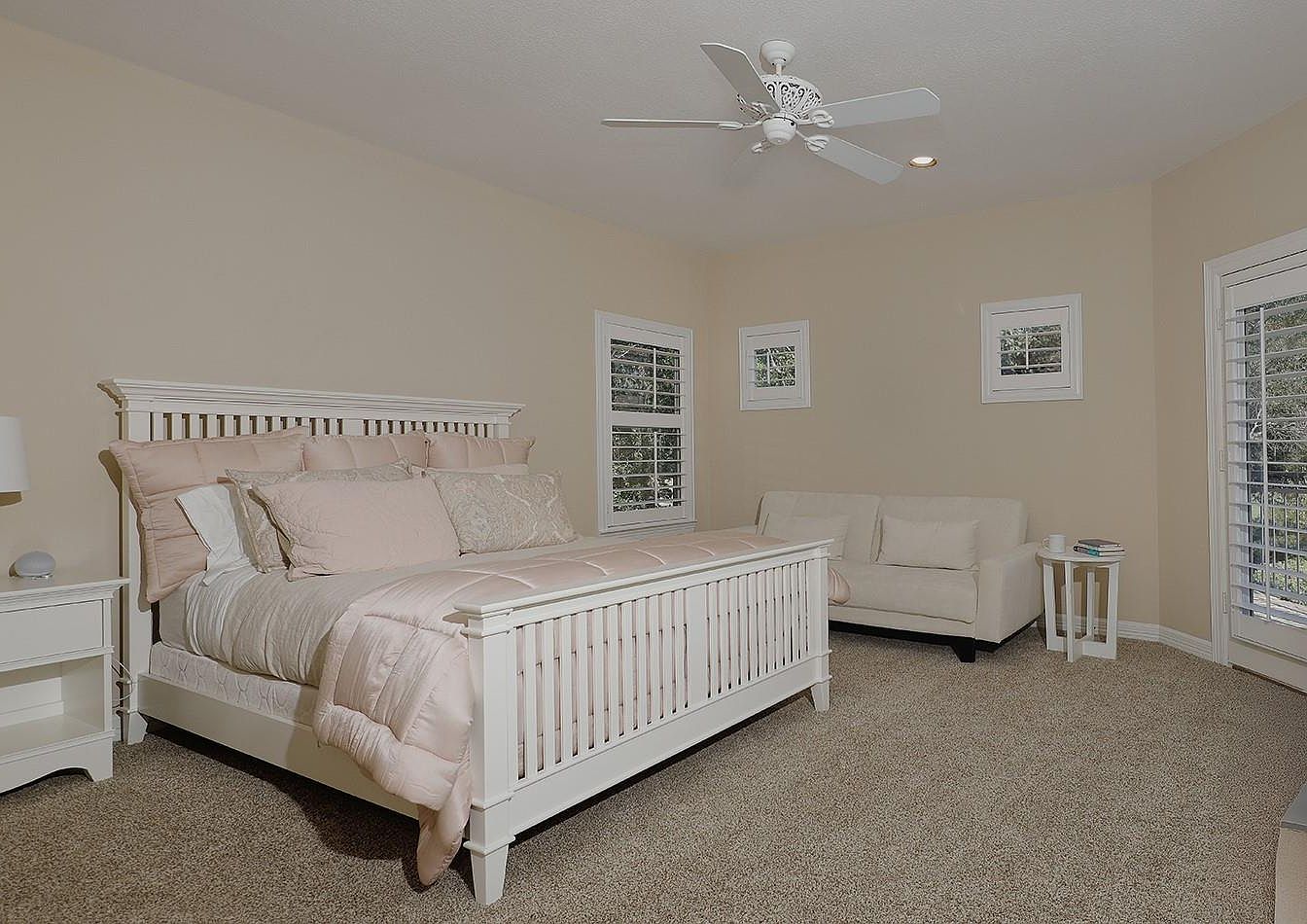 This spacious bedroom features a calming neutral palette with beige walls and light taupe carpeting creating a warm and inviting atmosphere. The white wooden bed frame with slatted headboard and footboard is dressed in soft, blush-toned bedding with plush pillows, adding an elegant yet cozy touch. Adjacent to the bed is a small white side table with a lamp, while near the corner, a minimalist cream loveseat offers a quiet seating nook. Shuttered windows allow natural light to filter in, and a ceiling fan with ornate detailing enhances comfort and style in the room.
