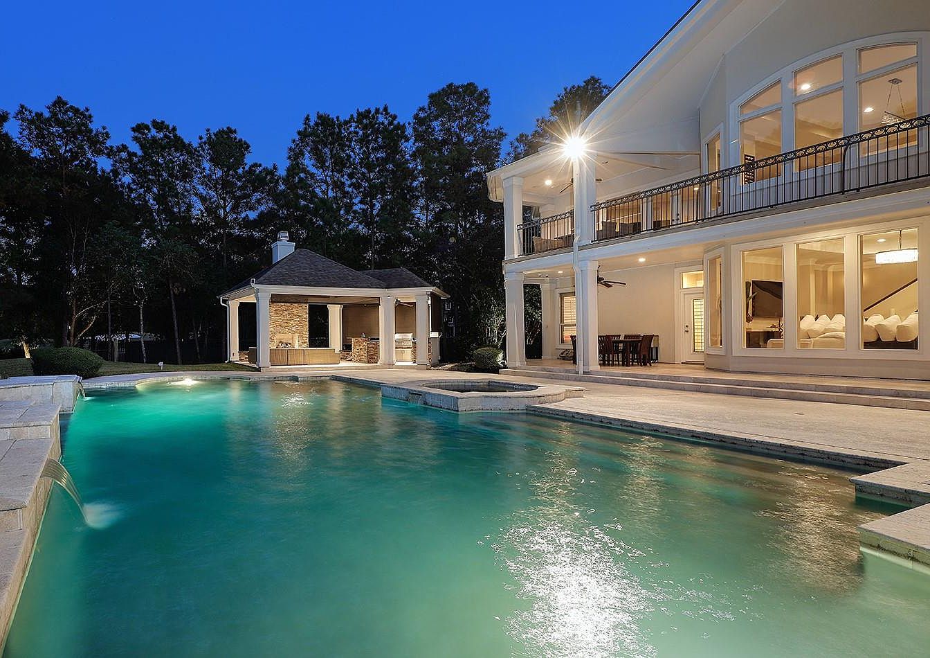 This expansive backyard area features a large, illuminated swimming pool with integrated water features flowing from raised sections, creating a tranquil ambiance. Surrounding the pool is a wide stone-paved patio that seamlessly connects to the two-story home, offering covered outdoor dining and lounging spaces underneath a balcony with classic black wrought-iron railings. A separate pavilion with stone accents and a chimney serves as an outdoor living or kitchen area, ideal for entertaining. Tall trees border the property, providing privacy and a natural backdrop that contrasts with the clean, modern white facade of the home. Soft, warm lighting enhances the inviting and elegant atmosphere during twilight.