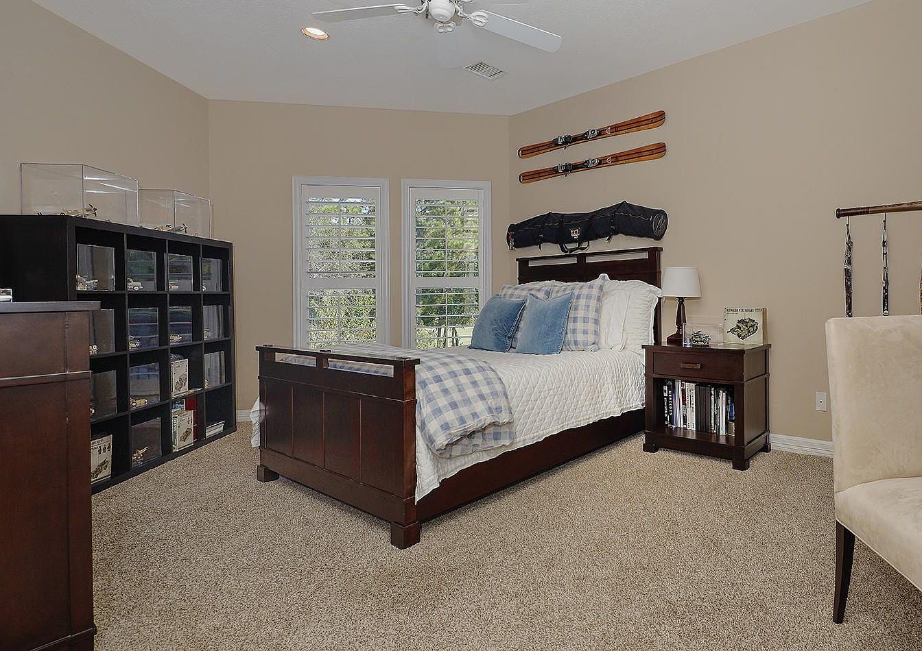 This comfortably sized bedroom features a warm, neutral color palette with beige walls and plush, light brown carpeting that adds to the cozy ambiance. A sturdy dark wood bed frame anchors the room, dressed in white quilted bedding accented with soft blue and checkered pillows and a matching throw. Two windows with white plantation shutters bring in ample natural light while maintaining privacy. On one side, a matching dark wood nightstand holds a lamp and small decorative items, while a black cubed shelving unit along the wall offers both storage and display space. Wall-mounted vintage wooden skis and an equipment bag add a personal, rustic charm, complementing the room’s inviting and uncluttered feel. A cream upholstered chair provides additional seating, enhancing the room’s functional and relaxing atmosphere.