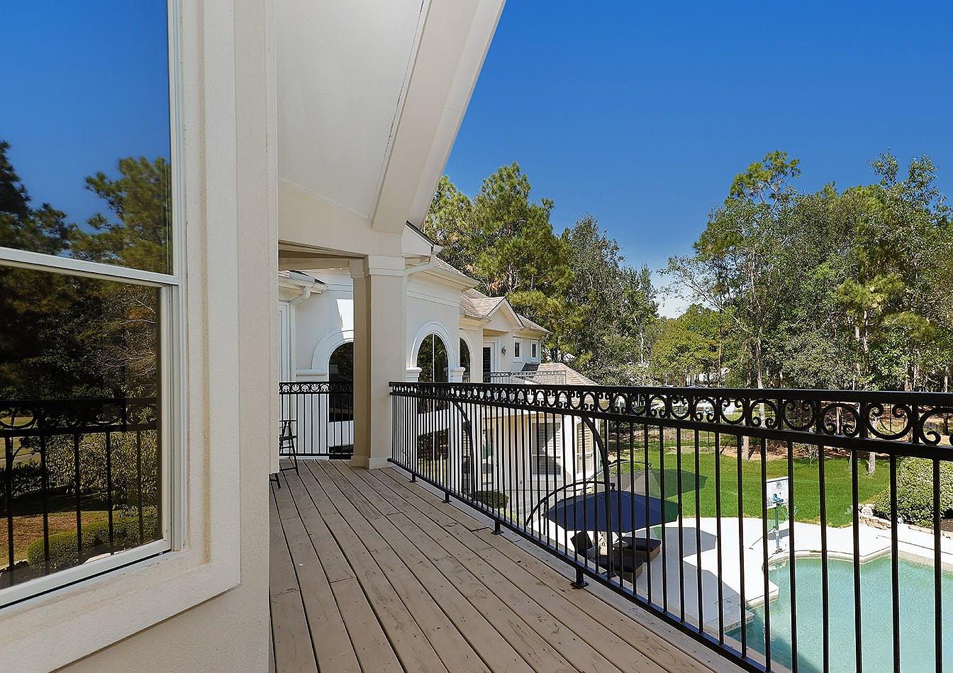 This serene second-floor balcony overlooks a beautifully landscaped backyard with a swimming pool. The balcony floor features natural-toned wooden decking, complemented by elegant black wrought iron railings with intricate scrollwork, adding a touch of classic charm to the space. The exterior walls are painted in a soft cream shade, harmonizing with the white trim around nearby arched windows. The vaulted ceiling above enhances the airy, open feeling, while the surrounding lush green trees and clear blue sky create a peaceful outdoor retreat perfect for relaxation or social gatherings.