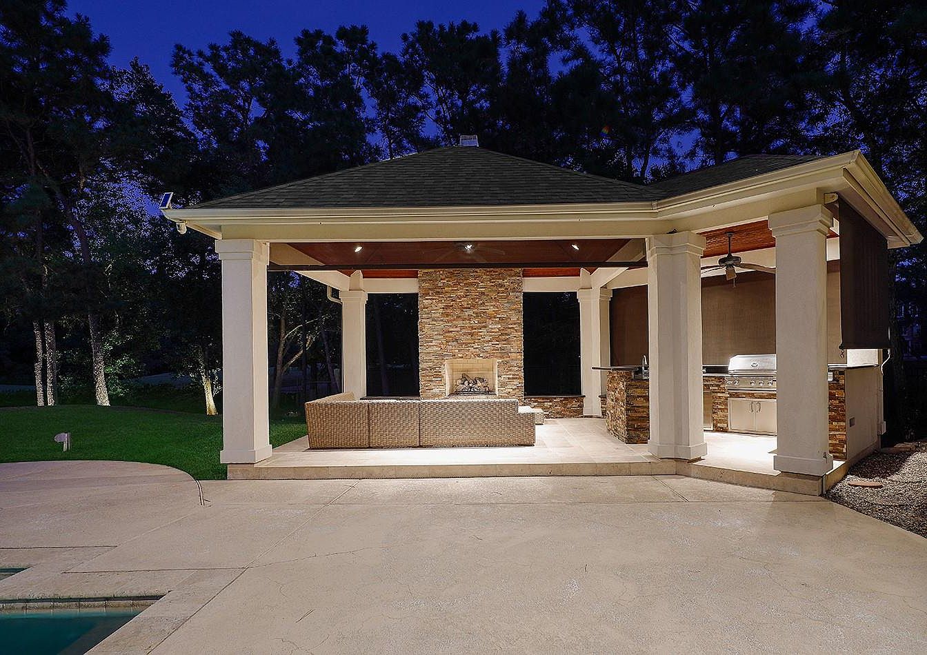 This stylish outdoor living area features a covered pavilion with a high, shingled roof supported by sturdy white columns. The space is anchored by a large stone fireplace clad in stacked natural stone, creating a warm and inviting focal point. A woven sectional sofa is positioned in front of the fireplace, offering ample seating for relaxation. Adjacent to this lounging area, a built-in outdoor kitchen includes stainless steel appliances and a stone bar, perfect for entertaining. The neutral color palette of beige, cream, and natural stone harmonizes with the surrounding greenery, while soft lighting highlights the cozy ambiance at night.