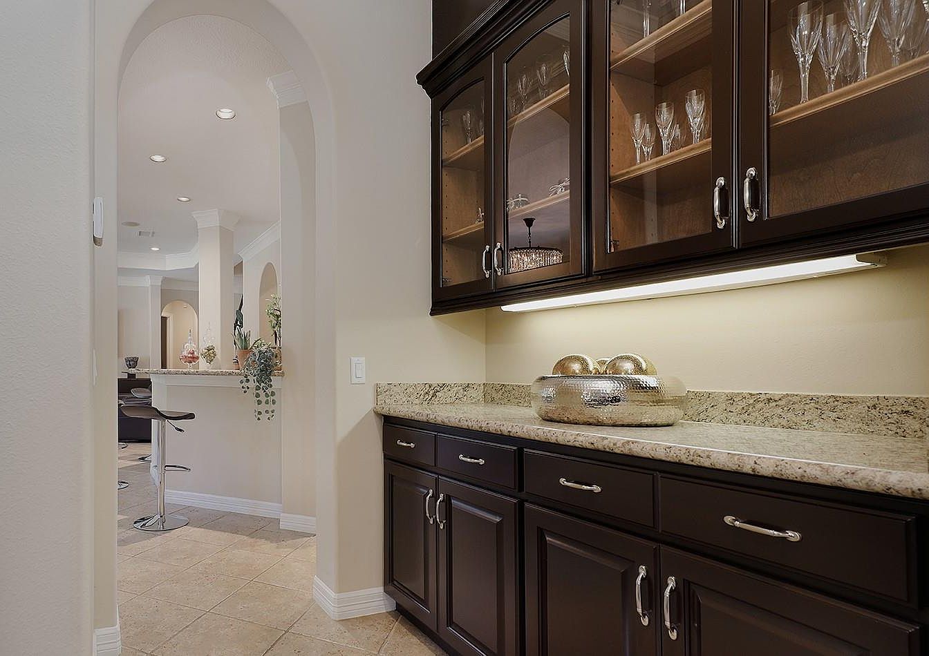 This space features a well-lit kitchen bar area with a smooth granite countertop in warm beige tones. Dark wood cabinetry with polished silver handles provides ample storage below and above, with the upper cabinets framed by glass doors displaying elegant glassware. The light cream walls complement the glossy tile flooring, adding a soft contrast to the dark cabinetry. An arched doorway leads to an adjacent breakfast bar, where modern chrome bar stools with dark seats offer seating. Crown molding and recessed lighting accentuate the classic yet contemporary appeal of this transitional kitchen space.