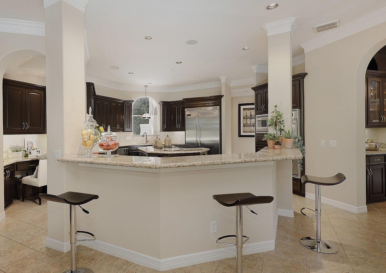 This kitchen features a spacious breakfast bar with a light granite countertop that wraps around an angular peninsula, providing ample seating space with sleek black bar stools that have chrome bases. The cabinetry is a rich dark wood, contrasting elegantly against soft beige walls and tiled flooring. Crown molding accents the ceiling, adding a refined architectural touch, while recessed lighting illuminates the space evenly. Stainless steel appliances, including a double-door refrigerator and built-in oven, blend seamlessly with the sophisticated and clean design. Decorative pots and glass jars add a touch of warmth and personality.