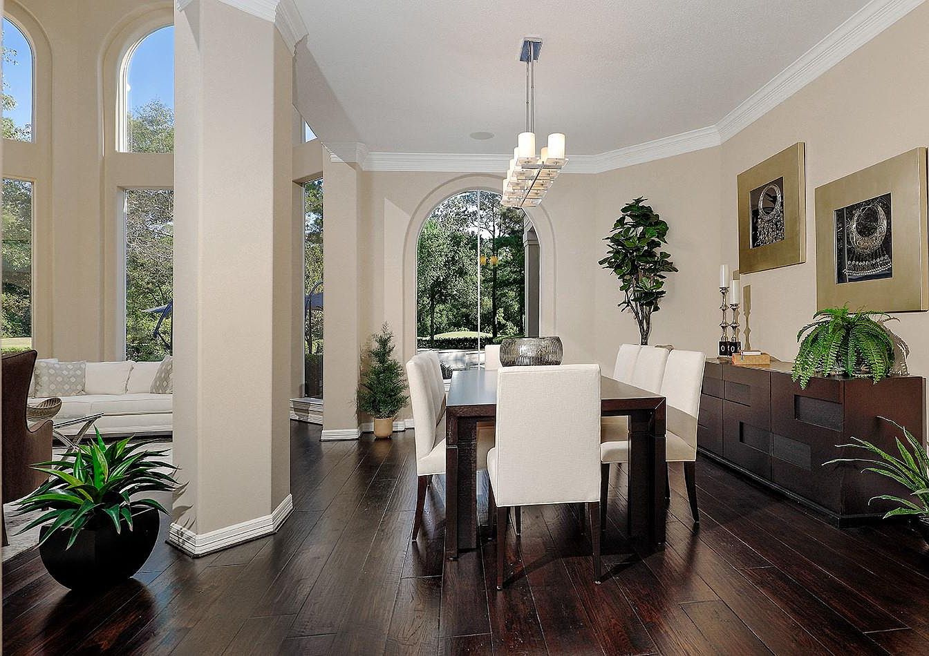 This elegant dining area features a rectangular dark wood table surrounded by six white upholstered chairs, creating a striking contrast with the rich, dark hardwood floors. Neutral beige walls and crown molding enhance the room’s smooth, airy feel. A modern linear chandelier with frosted glass shades hangs overhead, providing soft ambient light. Floor-to-ceiling arched windows flood the space with natural light and offer scenic garden views, while greenery in decorative pots adds freshness. On one side, a dark wooden sideboard holds minimalist decor and artwork framed in muted gold, rounding out a sophisticated, welcoming setting.