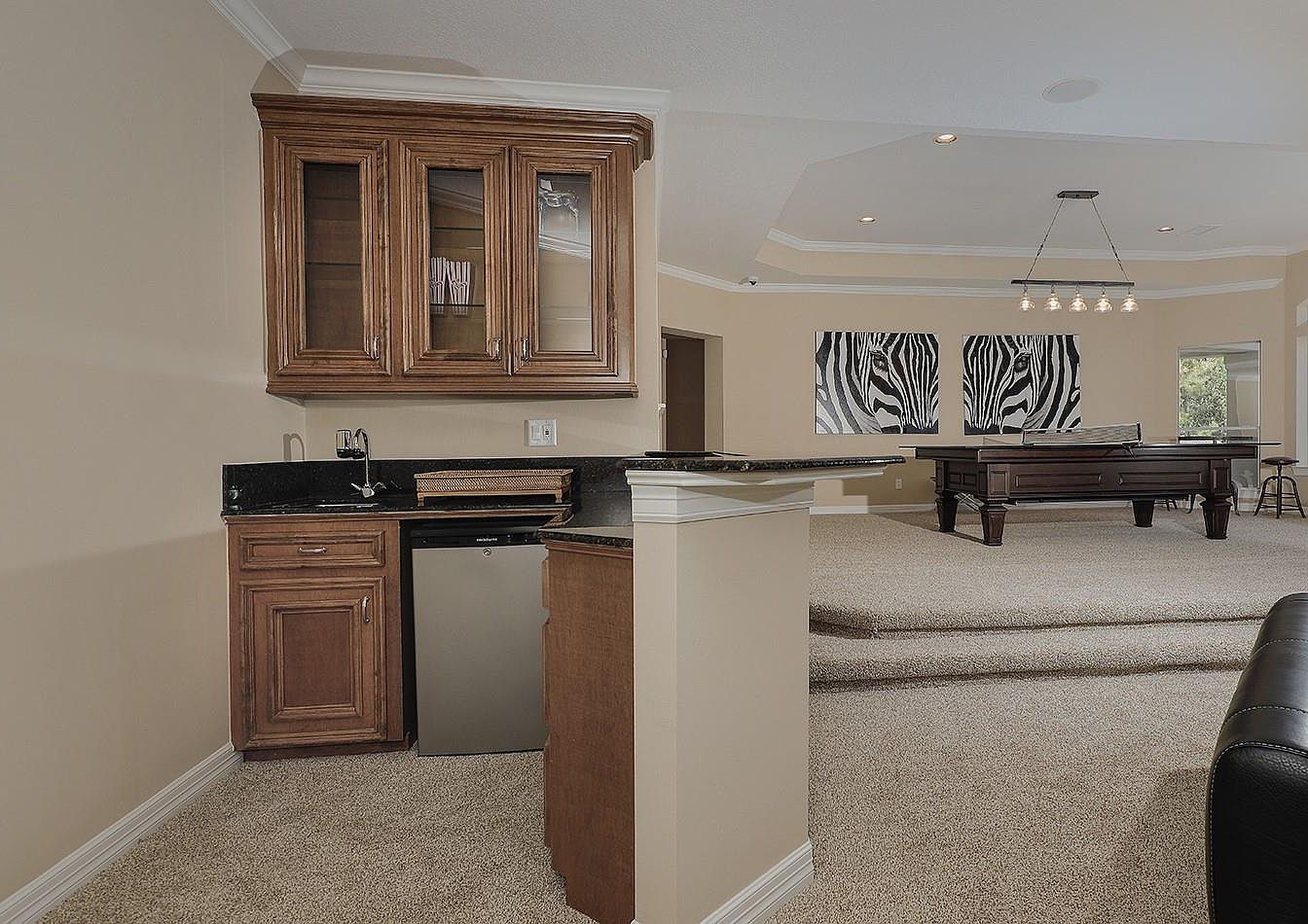 This cozy corner wet bar features classic wooden cabinetry with glass-paneled upper doors and a black granite countertop, adding a sleek touch. Below, a compact stainless steel mini-fridge complements the wood tones. The bar area subtly separates the elevated game room space, highlighted by two soft carpeted steps that provide a layered, inviting floor design. The walls are painted in a warm beige that pairs well with the neutral carpet. A stylish light fixture hangs above the pool table, which is set beneath two striking black-and-white zebra artwork panels, creating a chic entertainment zone.