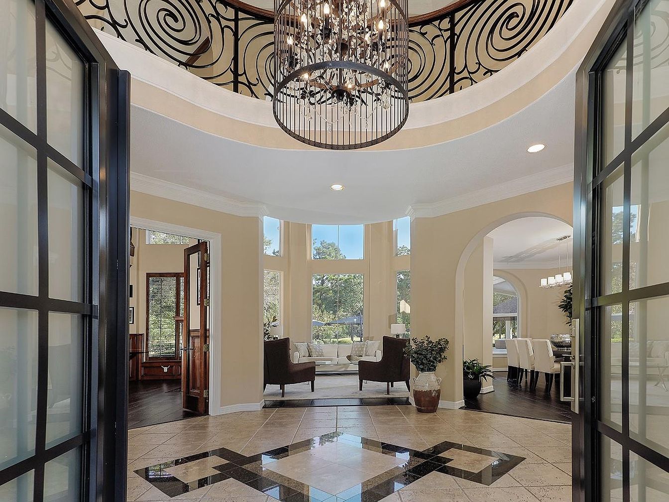 This grand entry foyer impresses with its high ceiling and sweeping curved balcony adorned with intricate wrought-iron railing in black. The polished tile floor features a sophisticated geometric pattern in cream and black tones, creating a striking focal point. Warm beige walls enhance the inviting atmosphere while recessed lighting illuminates the space. Floor-to-ceiling windows offer abundant natural light and views of the outdoor greenery. Through wide archways, the living and dining areas connect seamlessly, featuring dark hardwood floors and tasteful furnishings. A large chandelier with crystal accents hangs elegantly, completing the luxurious, welcoming aesthetic.