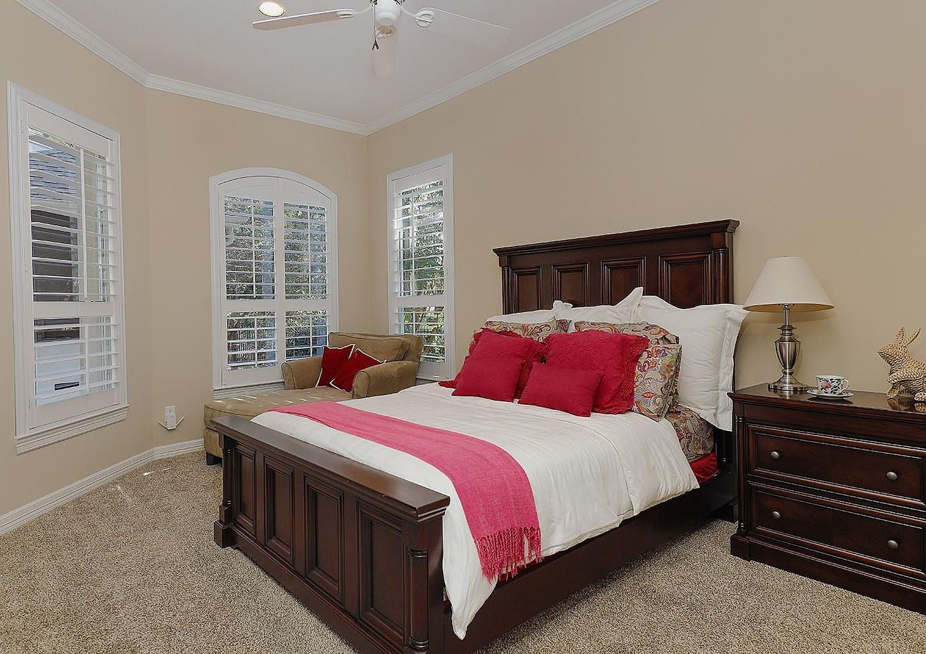This master bedroom features a warm, inviting color palette with beige walls and a plush, neutral-toned carpet. A dark wood bed frame with detailed paneling anchors the space, complemented by matching nightstands with classic drawer pulls. The bed is adorned with white bedding highlighted by vibrant red accent pillows and a coordinating throw, injecting lively contrast. Natural light filters through three white shuttered windows, including a distinctive arched central window, providing a serene and airy atmosphere. A cozy armchair with red accent pillows in the corner adds a comfortable reading nook, while a table lamp with a white shade offers soft lighting.