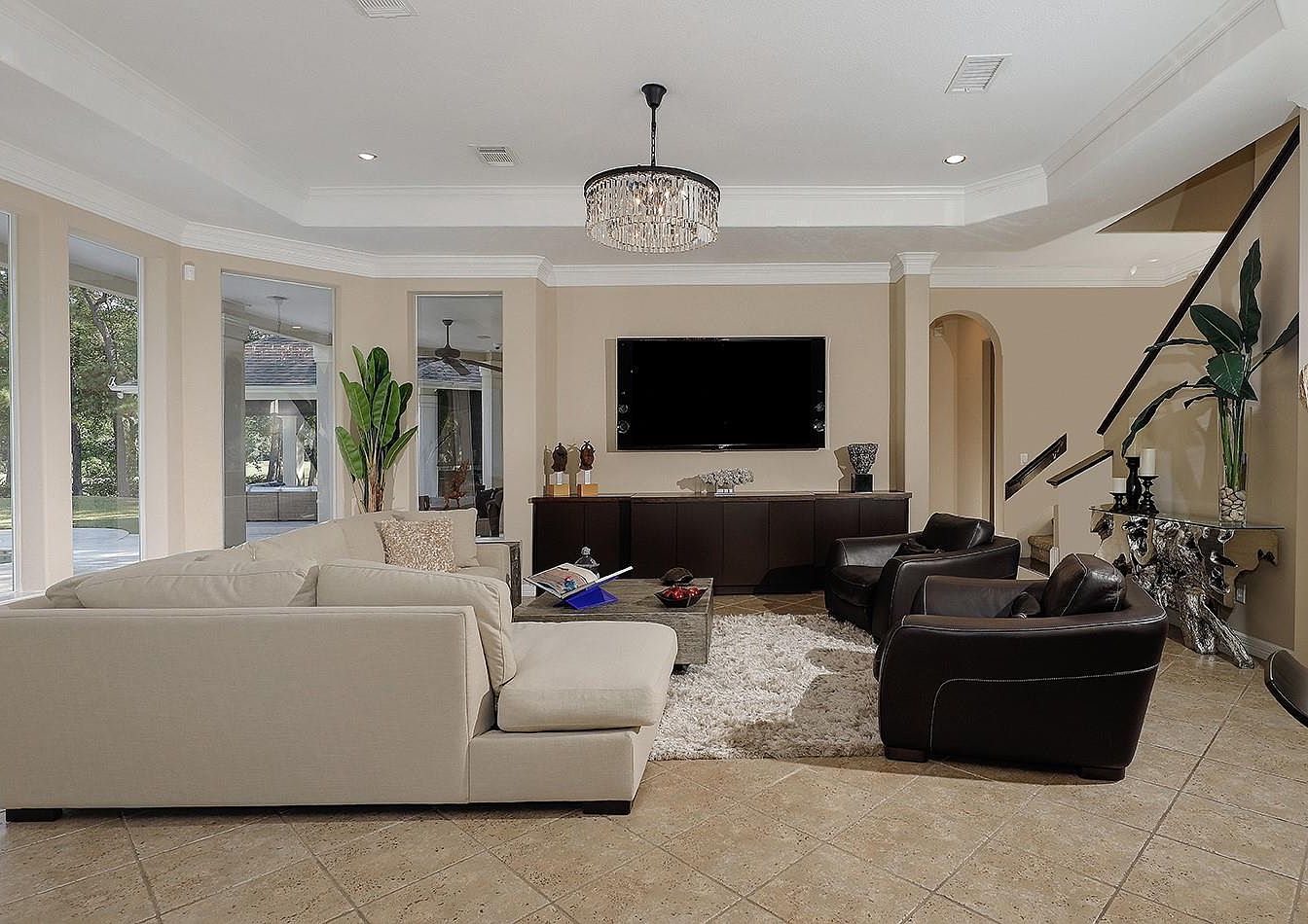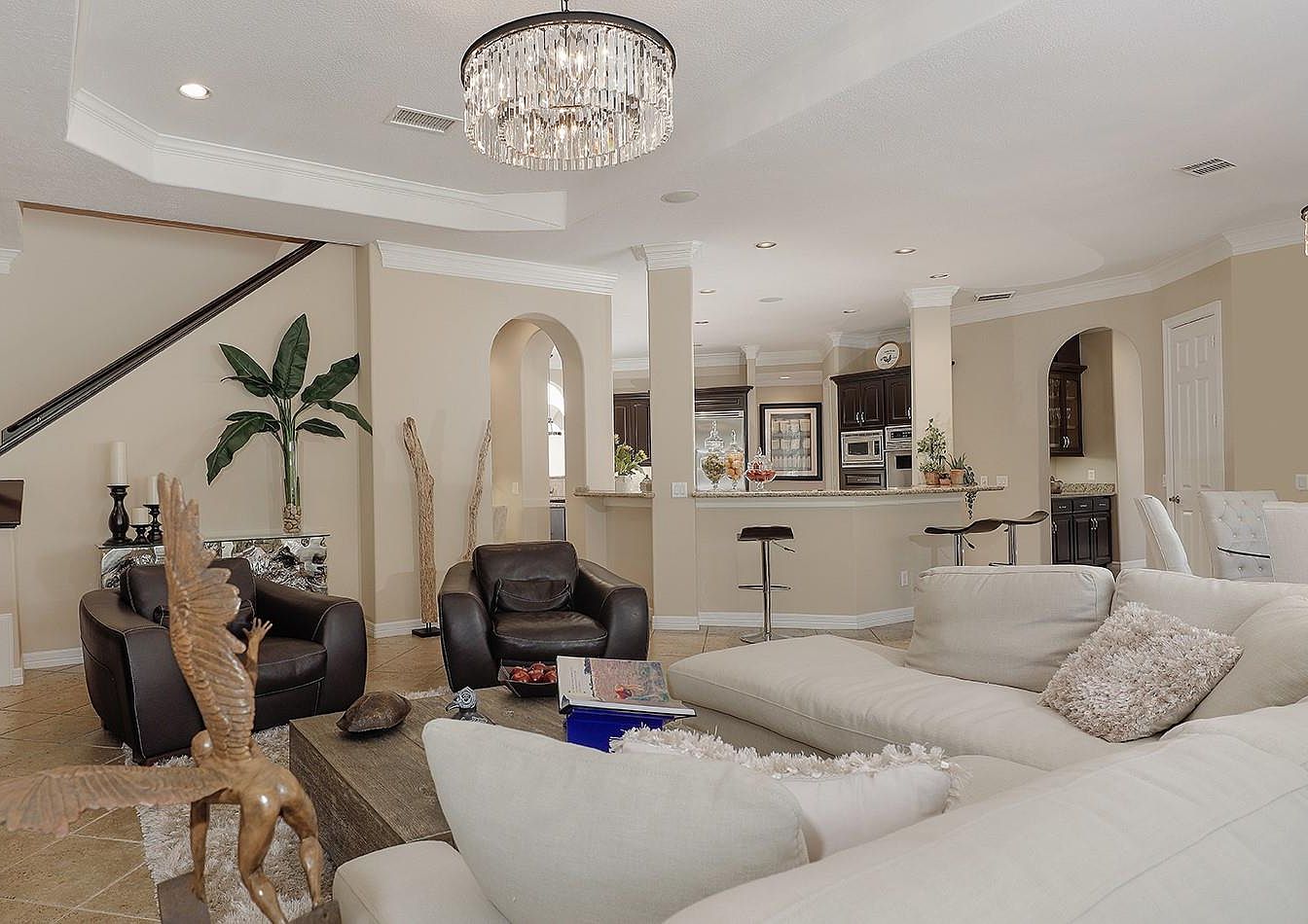 This spacious living area features a neutral beige color palette with white crown molding and trim, creating a warm and elegant atmosphere. The large, light-colored sectional sofa, complemented by plush pillows, invites relaxation. Two dark leather armchairs sit across a wooden coffee table adorned with decorative items, including a bronze eagle sculpture that adds character. The open layout seamlessly connects the living space to the kitchen, visible through arched doorways and a breakfast bar with modern barstools. A sparkling crystal chandelier overhead adds a touch of luxury, while recessed lighting ensures a bright, welcoming environment.