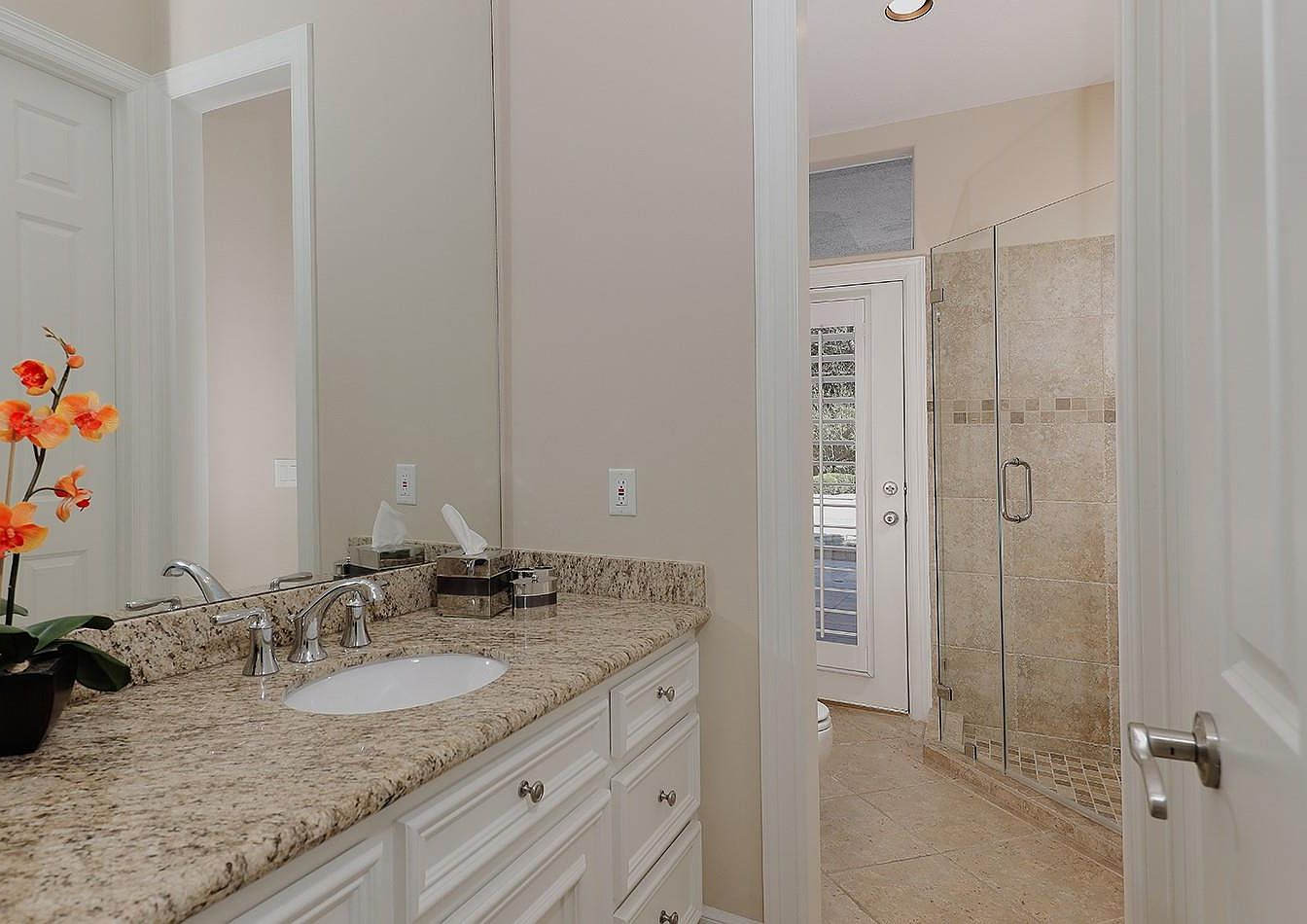 This bathroom area features a well-crafted vanity with a granite countertop in neutral beige tones, complementing the cream-colored cabinetry below. The polished silver faucet and matching hardware add a touch of elegance. A large mirror above the sink enhances the space, reflecting light and creating an open feel. To the right, a tiled walk-in shower with a glass door showcases warm, natural stone tiles that extend to the floor, creating a continuous flow. A door with white plantation shutters lets in natural light, adding brightness and privacy to the bathroom. The overall aesthetic is clean, warm, and inviting.
