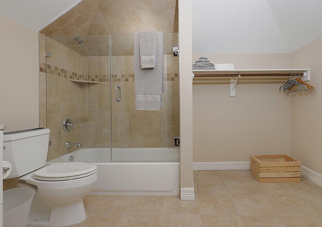 This space combines a bathroom with an adjacent closet area, featuring a neutral beige color palette that extends throughout the tile flooring and walls. The bathtub and shower are enclosed with a frameless glass door, complemented by beige tiles with a decorative horizontal band of small square accents near the top. Chrome fixtures add a subtle modern touch. The toilet is positioned next to the tub. The closet area is separated by a partial wall, equipped with a wooden hanging rod and several hangers, along with neatly folded towels and a wooden crate on the floor for storage, emphasizing simplicity and organization.