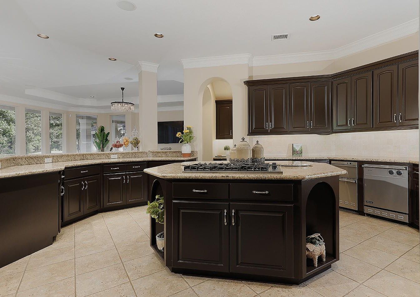 This spacious kitchen features a large, central island with a sleek granite countertop and a built-in gas cooktop, ideal for cooking and entertaining. The surrounding cabinetry is a rich, dark wood that contrasts beautifully with the neutral beige tile flooring and light tan walls. The countertops extend along the perimeter, providing ample workspace and storage, with polished silver hardware adding a contemporary touch. The ceiling is adorned with recessed lighting, while a distinctive crystal chandelier in the adjoining dining area introduces elegance. Natural light floods in through wide windows, brightening the open floor plan and highlighting the artful balance of luxury and practicality in this kitchen.