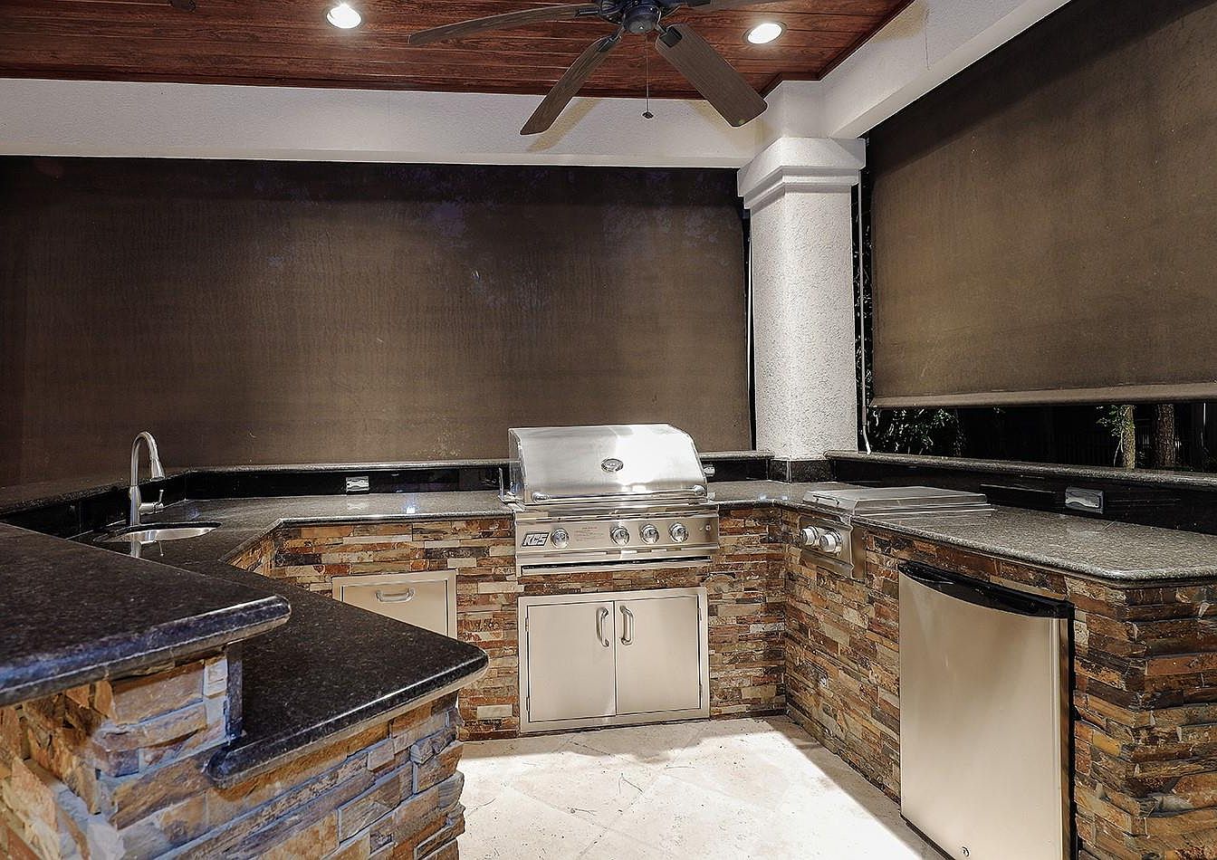 This sophisticated outdoor kitchen features a wraparound counter made of dark granite countertops paired with textured stonework on the base, presenting a rustic yet elegant vibe. Centrally placed stainless steel grill and built-in appliances including a small fridge and burner complement the cooking area, offering functionality and modern convenience. The ceiling is lined with warm-toned wooden planks and a ceiling fan to provide airflow, blending outdoor comfort with style. Roller shades on two sides add privacy and shade, completing this sleek and well-equipped space designed for entertaining and alfresco dining.