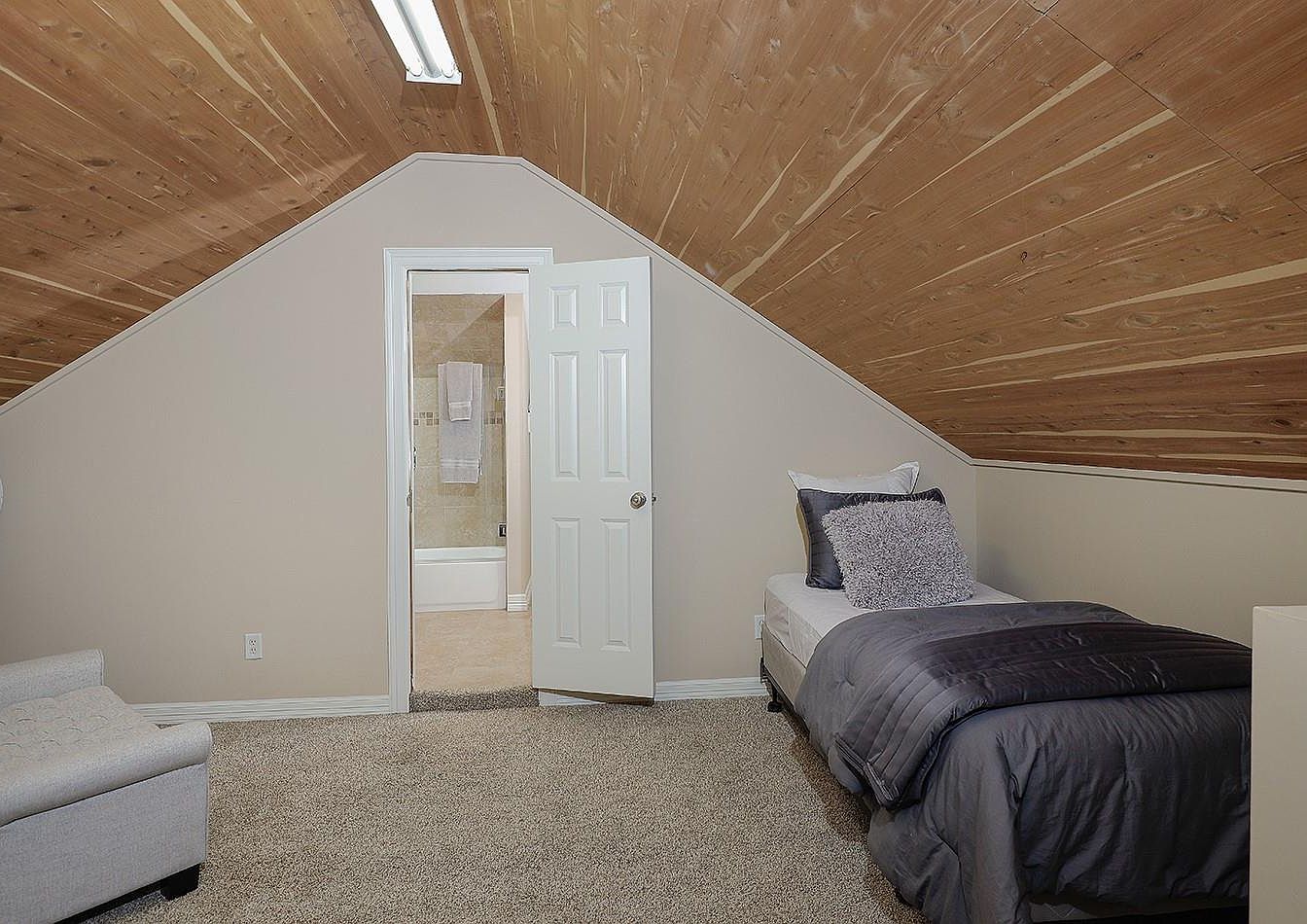 This intimate attic bedroom features a sloped wooden ceiling with natural grain that adds warmth and charm to the space. The walls are painted a soothing beige, complementing the plush, neutral-toned carpet underfoot. A single twin bed is neatly made with dark grey bedding and layered with textured pillows, creating a cozy yet modern feel. To the left, a comfortable upholstered chair offers a relaxing nook. The white door opens to an adjoining bathroom tiled in light stone, enhancing the room’s practical and inviting atmosphere with a clean, minimalistic design.