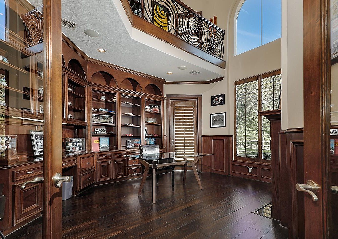 This home office exudes elegance with its rich wood finishes and high ceilings that invite natural light through expansive windows with plantation shutters. Floor-to-ceiling built-in bookshelves and cabinets in dark stained wood wrap the room, offering ample storage and display space. The sleek glass-top desk with wooden legs centers the room, paired with a black leather office chair that adds contrast and modernity. The adjoining second-floor balcony with ornate wrought iron railings overlooks the space, enhancing the open, airy ambiance while blending classic and contemporary design elements seamlessly.