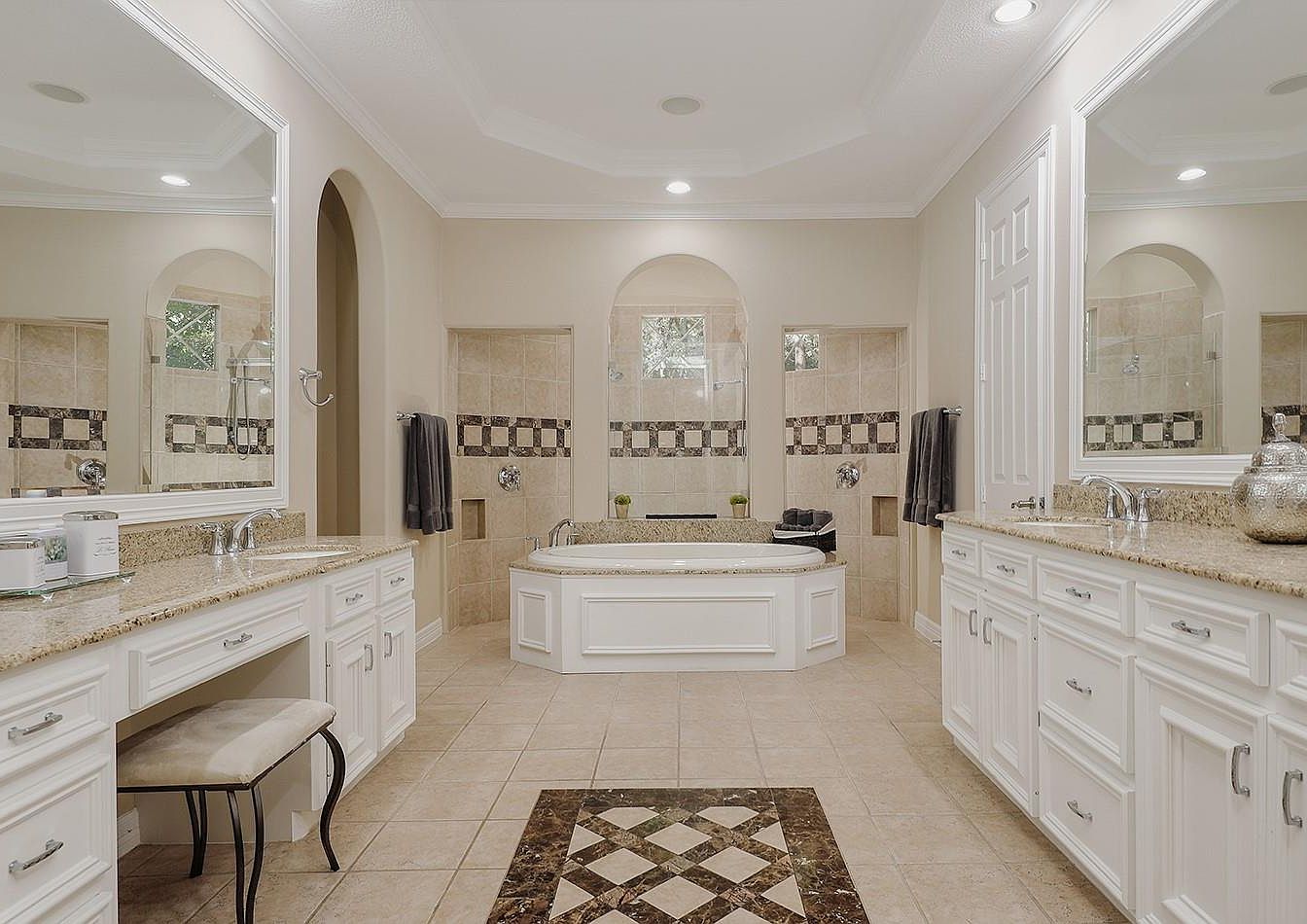 This spacious master bathroom embraces a classic, clean aesthetic with neutral beige walls and cream-colored tile flooring. Two large vanities with granite countertops and white cabinetry line either side, each accented by oversized framed mirrors that enhance the room’s brightness. A cushioned stool fits under one vanity for comfort and convenience. At the center, a white alcove bathtub with a granite surround is flanked by two arched niches tiled with a decorative band of checkerboard-style brown and cream mosaic tiles. The soft recessed lighting and elegant crown molding complete the serene, luxurious feel.