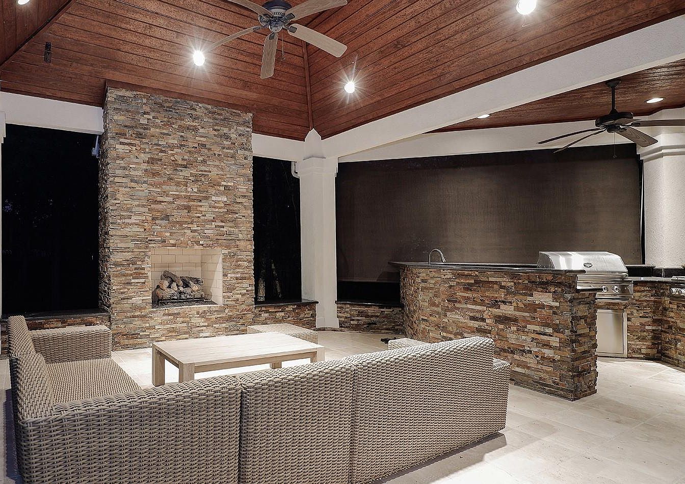 This covered outdoor living space combines rustic and contemporary elements seamlessly. A stone-clad fireplace anchors the seating area, surrounded by woven rattan-style sectional sofas in neutral tones, centered around a simple wooden coffee table. The ceiling, lined with warm-toned wood planks, features two ceiling fans to provide comfort in warmer weather. Adjacent to the seating zone is a built-in outdoor kitchen with matching stone veneer and a stainless steel grill, creating a perfect spot for entertaining. The light-colored tiled floor enhances the openness, while recessed lighting adds a cozy ambiance after dark.