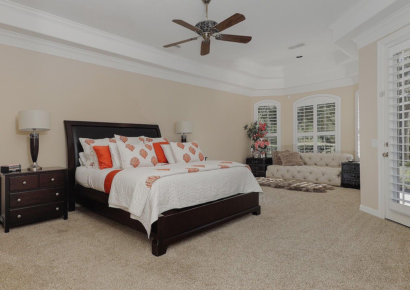 This spacious master bedroom features a warm, inviting palette of beige walls complemented by plush carpeting in a similar neutral tone. A dark wood bed frame anchors the room, dressed in crisp white bedding accented with vibrant orange and coral patterned pillows and a matching bed runner. Two matching dark wood nightstands flank the bed, each topped with elegant lamps featuring white shades and dark bases. The tray ceiling adds architectural interest and is highlighted by a classic ceiling fan with wooden blades. A cozy sitting area near large, arched windows includes a tufted beige loveseat and black side tables adorned with fresh floral arrangements. Natural light filters through white plantation shutters, enhancing the serene ambiance and seamless indoor-outdoor connection through glass French doors.