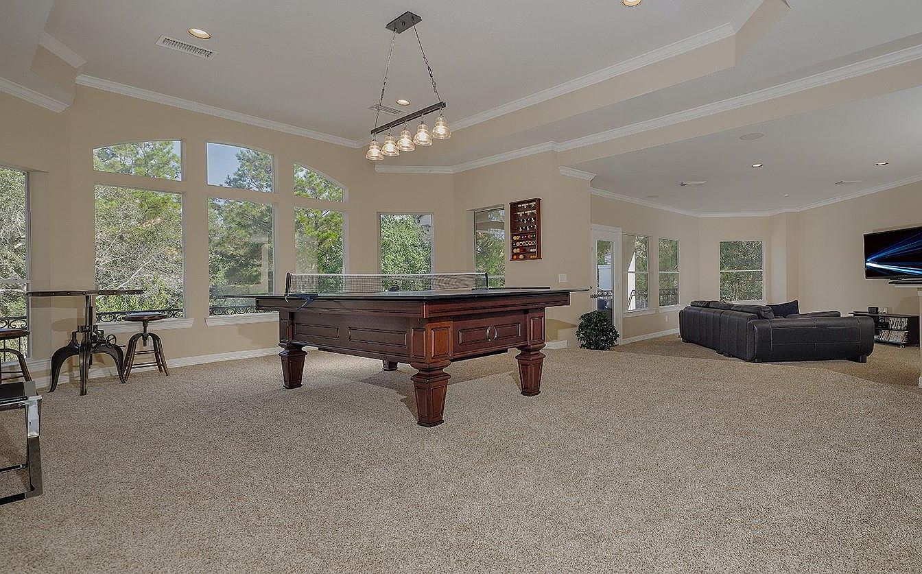This spacious recreation room features plush beige carpeting and a neutral color palette that enhances its bright and airy atmosphere. A large wooden pool table with intricate detailing holds center stage under a modern hanging light fixture. The room is framed by expansive windows with unique shapes that flood the space with natural light and offer tranquil views of surrounding greenery. A cozy seating area with a dark leather sectional and a flat-screen TV provides a comfortable spot for relaxation. Architectural crown molding and soft recessed lighting add a touch of elegance to this inviting entertainment space.