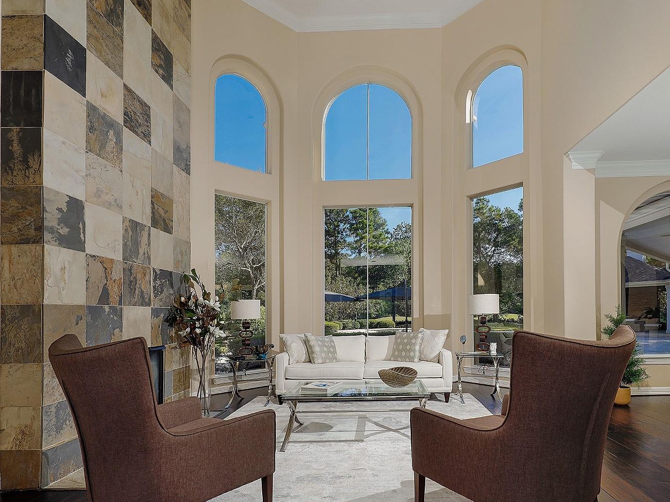 This sophisticated living room area features a high-ceiling space enhanced by a wall of tall, arched windows that flood the room with natural light and offer calming outdoor views. A pair of rich brown wingback chairs frame a sleek glass coffee table positioned before a crisp white sofa adorned with neutral patterned cushions. The walls are painted a creamy beige, complementing the large tiled fireplace that serves as a striking focal point with its varied earth-toned stone squares. Metallic side tables with modern, sculptural bases hold decorative lamps, tying warmth and elegance together in this inviting space.