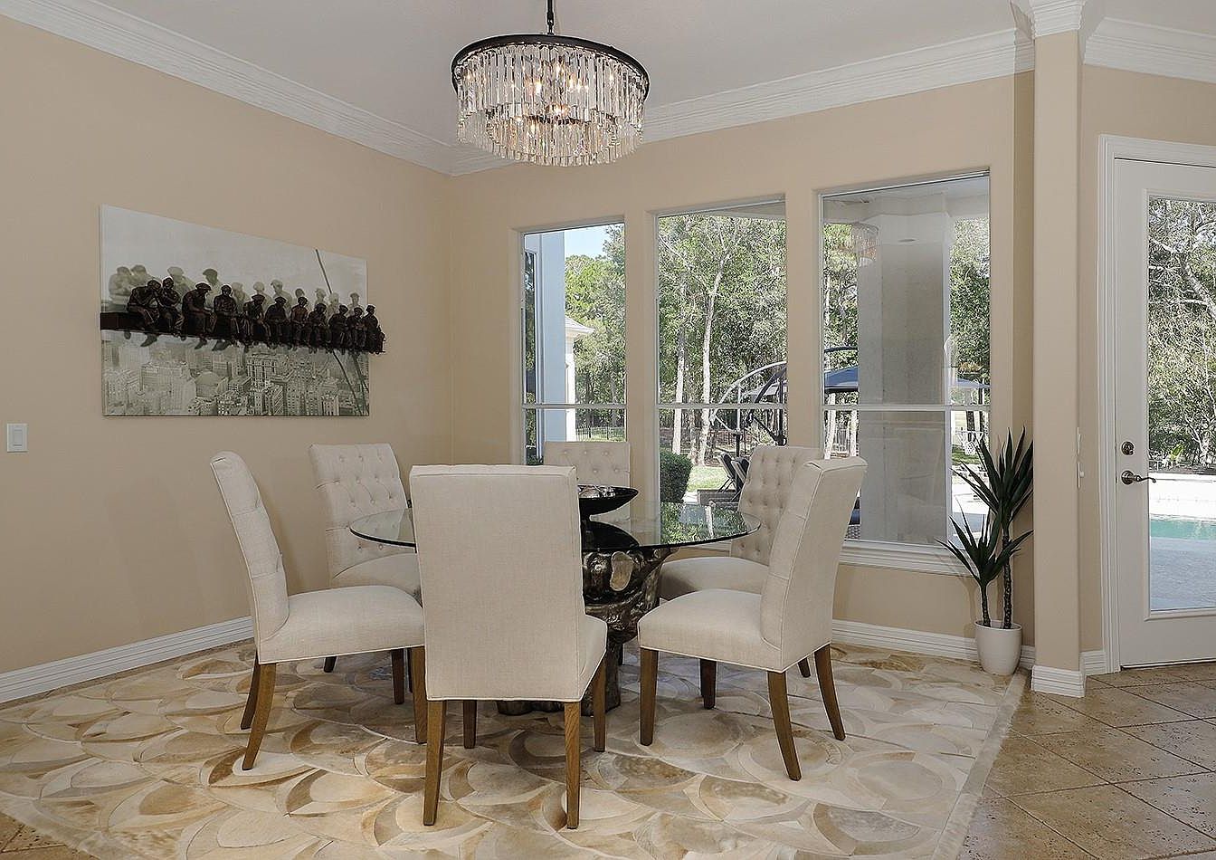 This dining area features a soft and neutral color palette with beige walls and a coordinating cream and tan patterned rug that anchors a round glass-top table with a sculptural base. The six upholstered dining chairs have a light linen fabric and wooden legs, lending both comfort and elegance. Floor-to-ceiling windows bathe the room in natural light while offering views of the lush greenery outside. A modern, crystal chandelier hangs above the table, adding sophistication and a touch of glamour. Decorative molding lines the ceiling, completing the refined look. A contemporary art piece on the wall and a potted plant by the door add style and warmth to the space.
