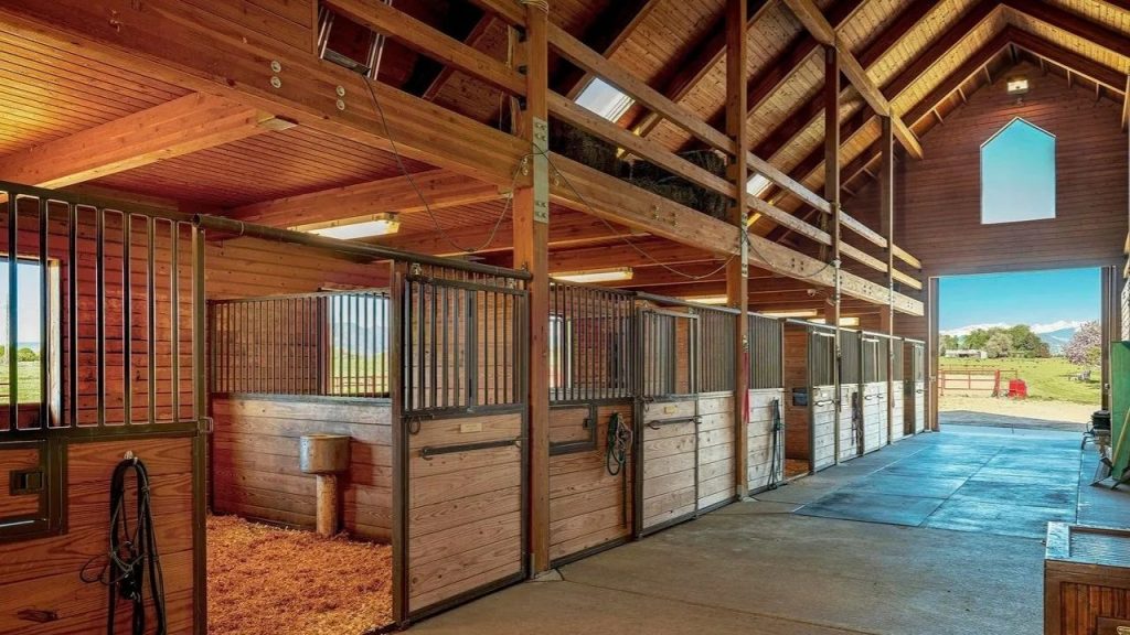 This impeccably crafted barn blends rustic charm with modern function, featuring warm-toned wood walls, soaring vaulted ceilings, and well-appointed stalls. Ample natural light pours in from clerestory windows and the wide-open barn doors, framing a serene view of snow-capped peaks in the distance. With hay storage above and polished concrete floors below, this space is both beautiful and built for purpose.