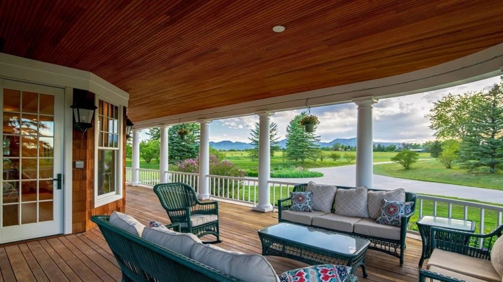 This inviting covered porch offers the perfect blend of comfort and classic style. Framed by stately white columns and warm wood-paneled ceilings, the space looks out over a sweeping drive and manicured landscape, with distant mountain peaks adding a dramatic backdrop. Wicker seating and hanging planters create a relaxed atmosphere, ideal for enjoying slow mornings or quiet sunsets in timeless elegance.