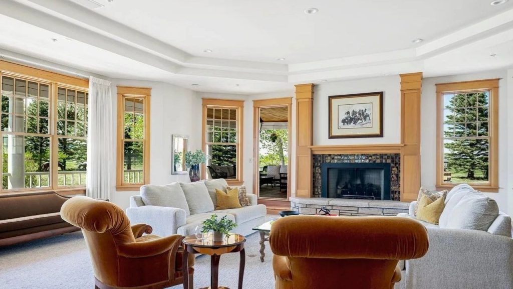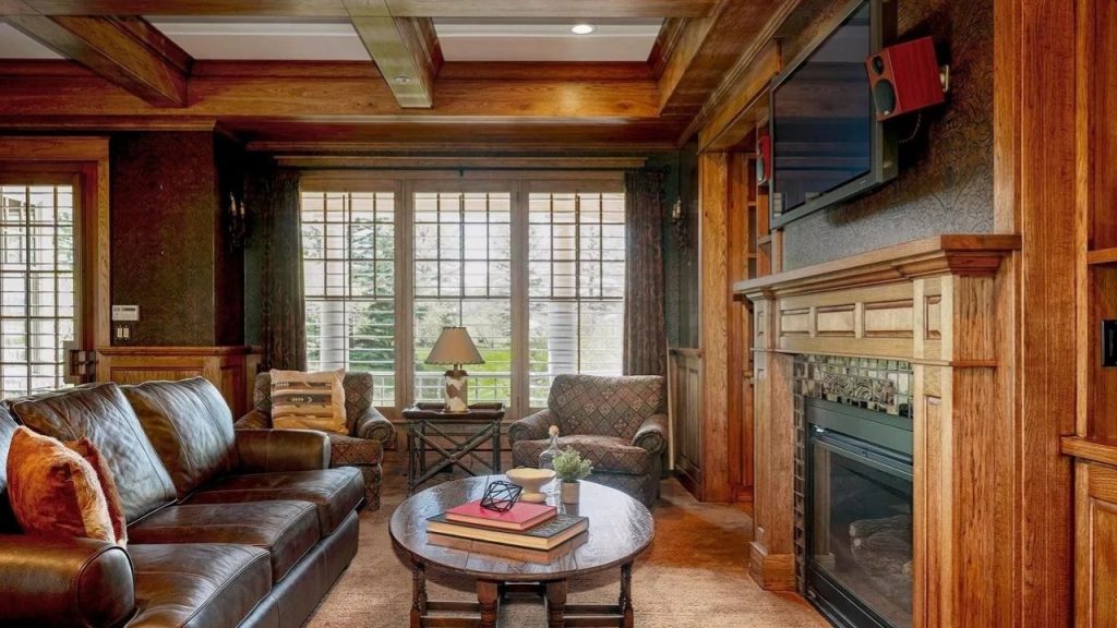 This intimate den blends traditional charm with rustic elegance. Rich wood paneling and coffered ceilings create a warm, enveloping atmosphere, while the stone-accented fireplace adds a grounding focal point. A leather sofa and patterned armchairs invite relaxed gatherings, framed by large windows with wooden shutters that filter soft natural light. It’s a timeless retreat perfect for quiet evenings or casual conversation.