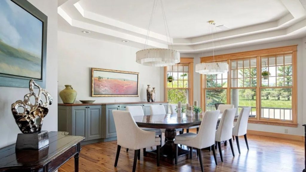 This sophisticated dining space blends contemporary elegance with rustic charm. A dark wood table anchors the room, surrounded by plush, upholstered chairs that invite long, comfortable meals. The large windows flood the area with natural light, offering serene views of the lush landscape outside. Soft, neutral tones on the cabinetry complement the earthy wood flooring, while two modern chandeliers add a touch of luxury overhead. Carefully chosen artwork and sculptural accents bring personality and refinement to the space.