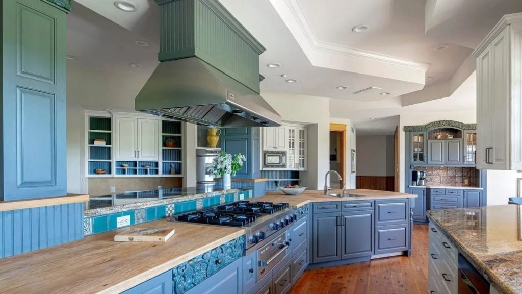 This kitchen blends rustic charm with modern function, featuring teal and slate blue cabinetry, warm wood countertops, and a striking range hood. Decorative tiles and open shelving add personality, while the large island and ample storage enhance usability. Stainless steel appliances and a cozy coffee nook complete the space’s stylish and practical appeal.