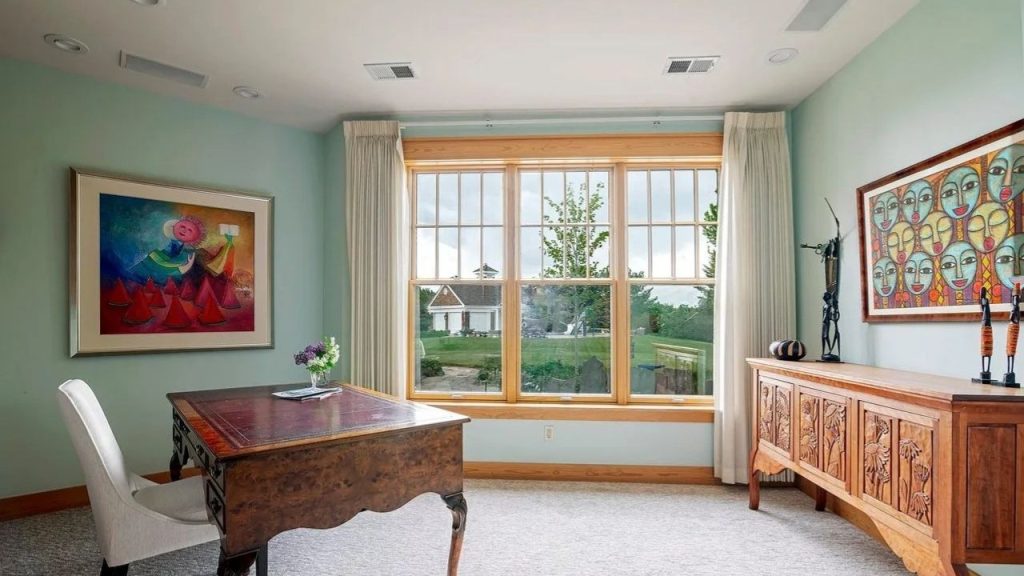This cheerful study pairs clean lines with cultural richness. A large picture window frames the manicured lawn, flooding the room with natural light. Soft green walls provide a calm backdrop for vibrant artwork, while a carved wood console and antique desk bring depth and texture. Minimal yet expressive, this space balances creativity and focus, perfect for thoughtful work or quiet reflection.