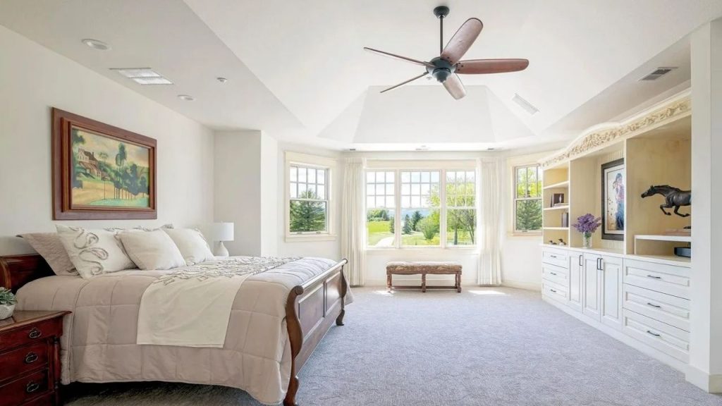 This airy primary bedroom is a retreat of calm and comfort. Soft natural light pours through three large windows, illuminating the neutral palette and plush textures. A vaulted ceiling with a wood-blade fan adds architectural interest, while custom built-ins provide both charm and function. The elegant sleigh bed anchors the space, perfectly positioned to take in the lush garden beyond.