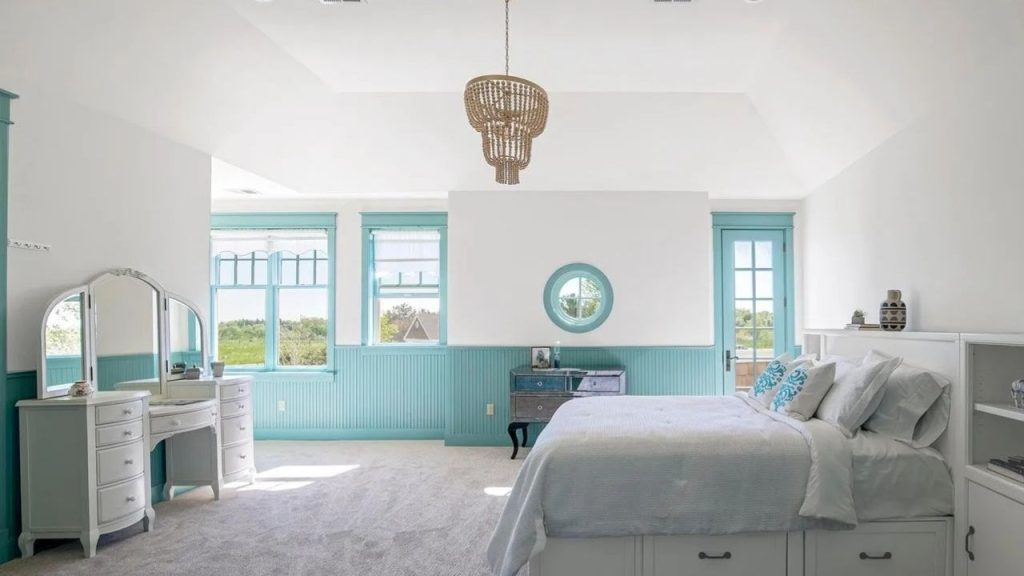 This bright bedroom blends coastal charm with vintage elegance. The seafoam blue trim and beadboard wainscoting evoke breezy seaside vibes, while the circular window and matching French door add whimsical character. Built-in storage under the bed and classic vanity bring both form and function. With soft natural light and serene views, it’s a dreamy, tranquil escape.
