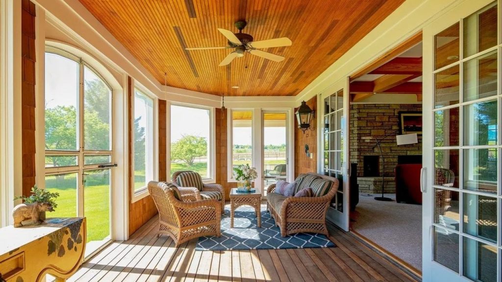 This cozy screened-in porch is the perfect blend of rustic and refined. The warm wood ceiling and matching floorboards give it a cabin-like feel, while the large windows and French doors flood the space with natural light and panoramic views of lush greenery. Wicker furniture with plush cushions invites laid-back lounging, and the ceiling fan ensures a breeze even on still summer days. A charming spot for morning coffee or sunset chats.