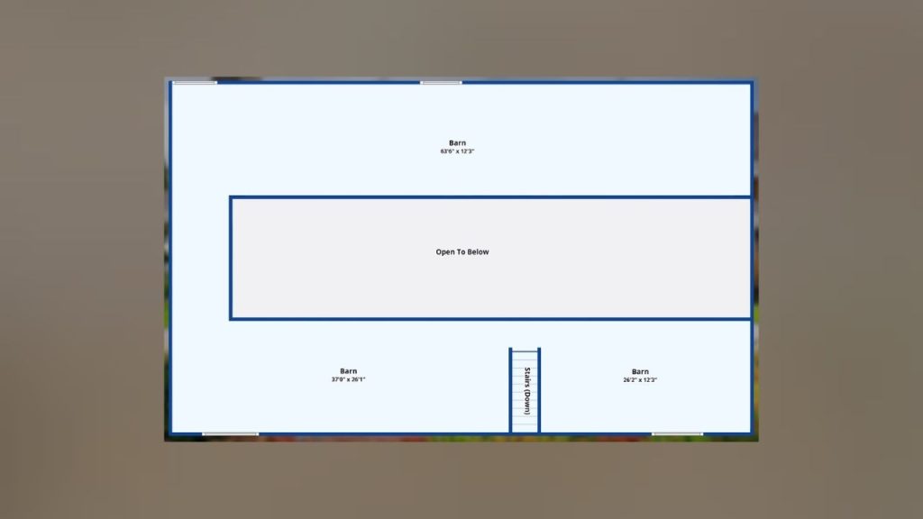 The upper level of the barn offers versatile space with three distinct areas: a spacious 37’0″ x 26’1″ section ideal for storage or work, and two narrower wings (63’6″ x 12’3″ and 26’2″ x 12’3″) suited for tack rooms, feed, or tools. A central open-to-below area creates a dramatic view of the lower level while maintaining an airy feel. Accessed by stairs, this lofted layout enhances both function and flexibility for various uses.