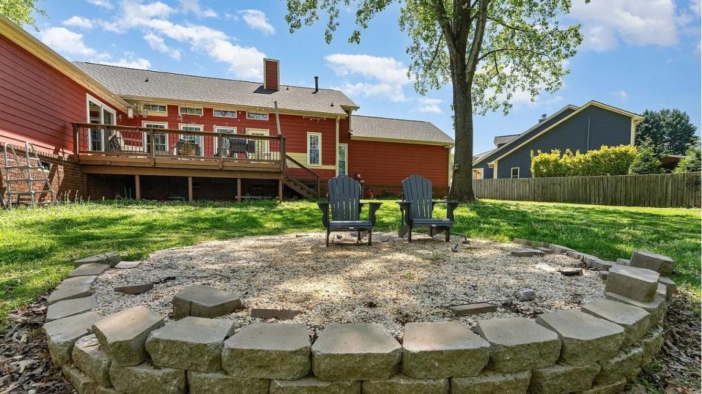 Nestled beneath mature trees, this charming backyard in Cornelius, North Carolina, offers a peaceful escape with classic Southern appeal. A raised wood deck extends from the home, perfect for outdoor dining or gatherings. Below, a circular gravel fire pit area framed in stone creates a cozy setting for conversation. This thoughtfully designed outdoor space invites both relaxation and entertainment.