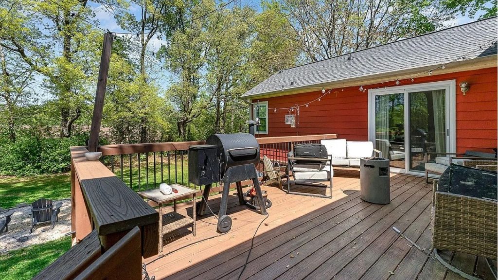 The rear deck of this Cornelius home extends the living space outdoors, offering a generous layout ideal for gatherings or quiet evenings. Surrounded by mature trees and strung with café lights, the space features room for a grill, ample seating, and seamless access to the backyard. Whether hosting summer barbecues or enjoying a tranquil Carolina sunset, this inviting space is designed for effortless outdoor living.