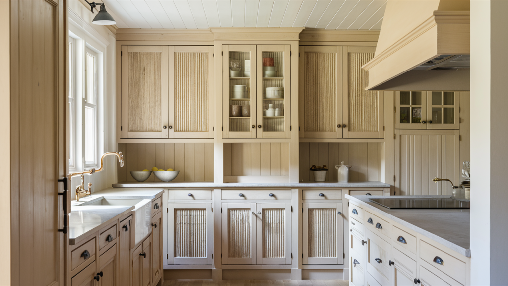 Inserting beadboard panels into cabinet doors brings a cozy, cottage-style charm that refreshes plain wood surfaces. This textured, vertical slat design adds warmth and dimension while remaining timeless. Beadboard works well with painted or stained cabinets and pairs beautifully with both rustic and modern kitchens. It’s a simple way to add handcrafted detail and personality without replacing entire doors.