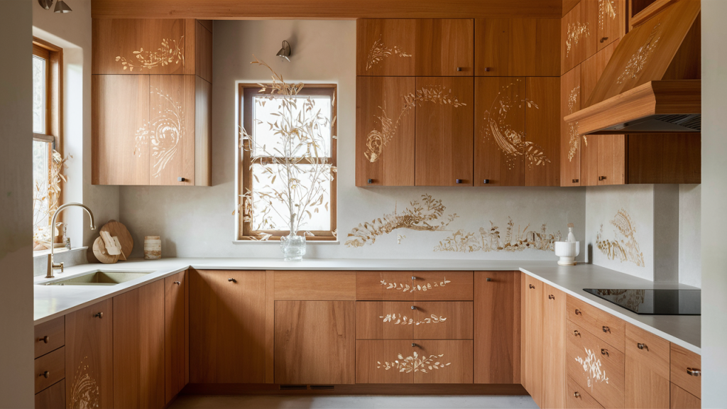Wooden decals or appliques offer a creative way to add intricate patterns or accents to flat cabinet surfaces. These decorative pieces can be stained or painted to match your cabinetry and installed with adhesive for a no-fuss update. From floral motifs to geometric shapes, appliques bring artistry and texture that make your cabinets stand out, turning everyday wood into a bespoke statement piece.