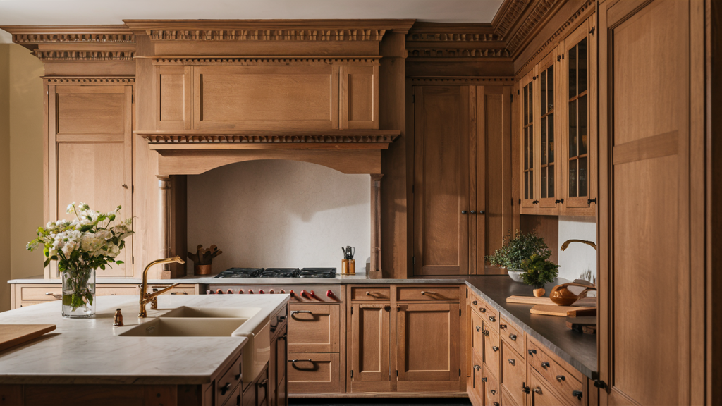 Adding decorative molding to cabinet doors or along edges creates dimension and a custom look without repainting. Whether it’s simple trim or intricate designs, molding adds architectural interest and a sense of craftsmanship. This update can mimic a high-end renovation, making basic cabinetry feel custom-built and more elegant, all while highlighting the wood’s natural warmth.
