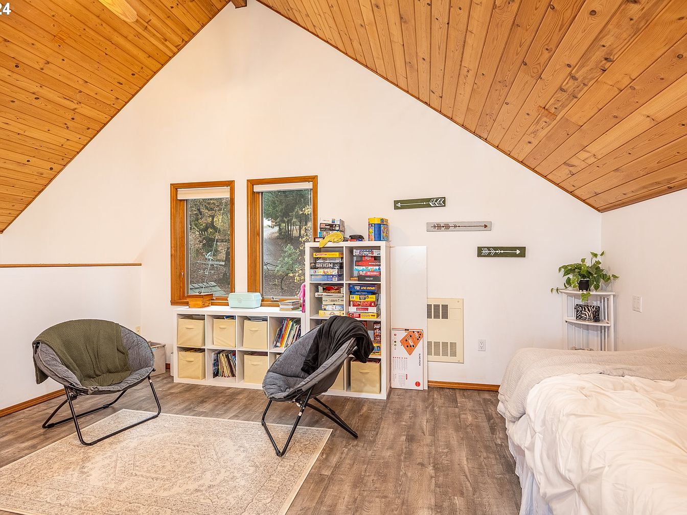 This loft area features a charming A-frame ceiling clad in warm, natural wood planks, contrasting softly with crisp white walls that brighten the space. The medium-toned wood flooring complements the ceiling’s warmth, creating a cohesive look. A pair of plush, cushioned chairs invite relaxation on a subtle patterned rug. Storage is functional and playful, with a modular white shelving unit that holds board games and fabric bins, adding a casual, family-friendly touch. Twin windows bring in natural light and a view of the outdoors, while simple wall decor with directional arrows adds personality. A comfortable bed tucked into the right corner completes this cozy retreat.